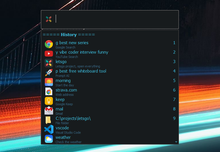 , ํ์ผ, ํด๋, ์น์ฌ์ดํธ, ์น ์๋น์ค(๋งค๊ฐ๋ณ์ ํฌํจ) ๋ฐ ํ๋กฌํํธ๋ฅผ ๋ฐ๋ฆฌ์ด ๋จ์๋ก ์คํํ ์ ์์ต๋๋ค. ๋ค์ํ ํค ๋ฐ์ธ๋ฉ ์ต์